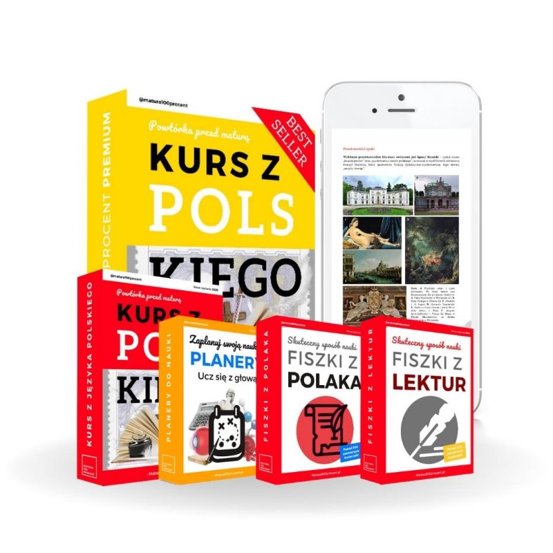 Fiszki, które kupiłeś stanowi część maturalnej kolekcji PREMIUM. W jej skład wchodzi Kurs z Języka Polskiego w formie e-book (opracowania + 2 zestawy fiszek) oraz Kurs z Języka Polskiego Wideo (5 serii wideo nt. najważniejszych lektur).